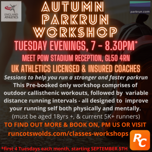 PARKRUN AUTUMN WORKSHOPS, CHELTENHAM – CURRENTLY UNAVAILABLE FOR BOOKING. PLEASE E-MAIL US TO REGISTER INTEREST.